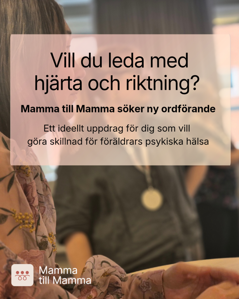 Mamma till Mamma söker ny ordförande Vill du bidra till att förbättra förutsättningarna för psykisk hälsa i samband med föräldrablivande och föräldraskap? Mamma till Mamma söker nu en ny ordförande till vår styrelse. Mamma till Mamma är en ideell organisation som sedan 2017 erbjuder stöd, samhörighet och förståelse till personer som mår psykiskt dåligt i […]